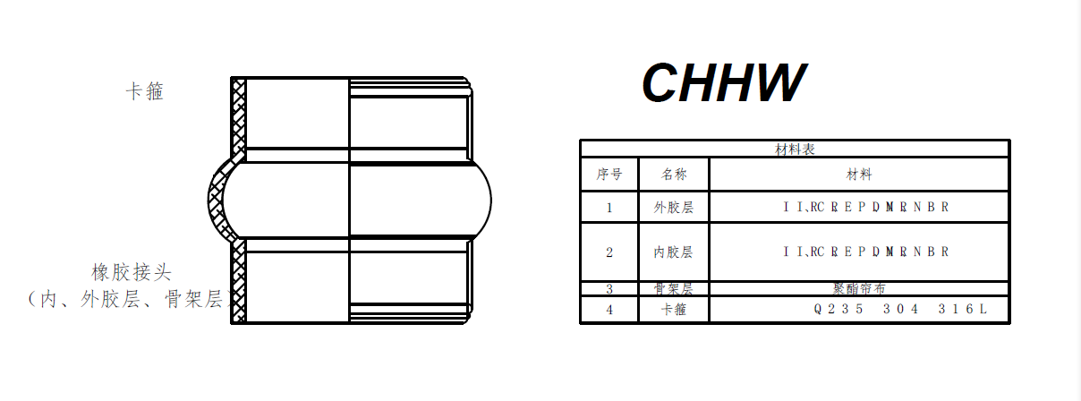 | 2 | 內、外襯 Inner & Outer Rubber | 天然橡膠(NR) 氯丁橡膠(CR)丁基橡膠(IIR) 丁腈橡膠(NBR)氟橡膠(FKM)三元乙丙橡膠(EPDM)聚四氟乙烯(PTFE) |