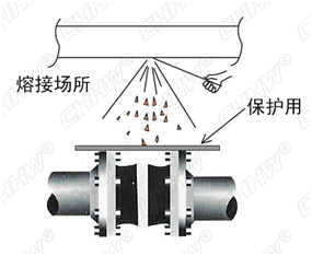五、安裝完成后,如在產(chǎn)品附近,進行焊接或焊割的話,請用板材或布料蓋住產(chǎn)品以免濺到火花。如有焊接或焊割引起的傳熱危險,請采取把撓性單球體橡膠接頭從管道上坼下來等應對措施。(如下圖)