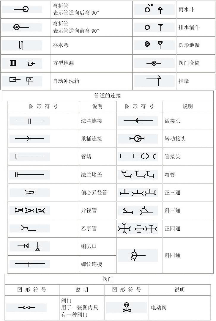 彎折管 表示管道向后彎 90° 彎折管 表示管道向前彎 90° 存水彎 方型地漏 自動沖洗箱 管道的連接 圖 形 符 號 說明 法蘭連接 承插連接 管堵 法蘭堵蓋 偏心異徑管 異徑管 乙字管 喇叭口 圖 形 符 號