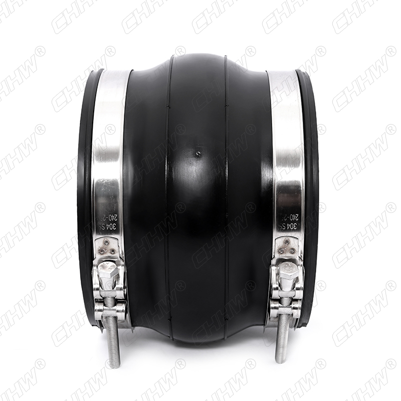 卡箍式可曲撓橡膠接頭采用增強型不銹鋼304抱箍。由織物增強的橡膠件與平形活接頭、松套金屬法蘭或螺紋管法蘭組成,用于管道隔振降噪、補償位移的接頭。它是一種高彈性、高氣密性、耐介質性和耐氣候性的管道接頭。按結構分為:單球體、雙球體、彎頭球體。如圖: