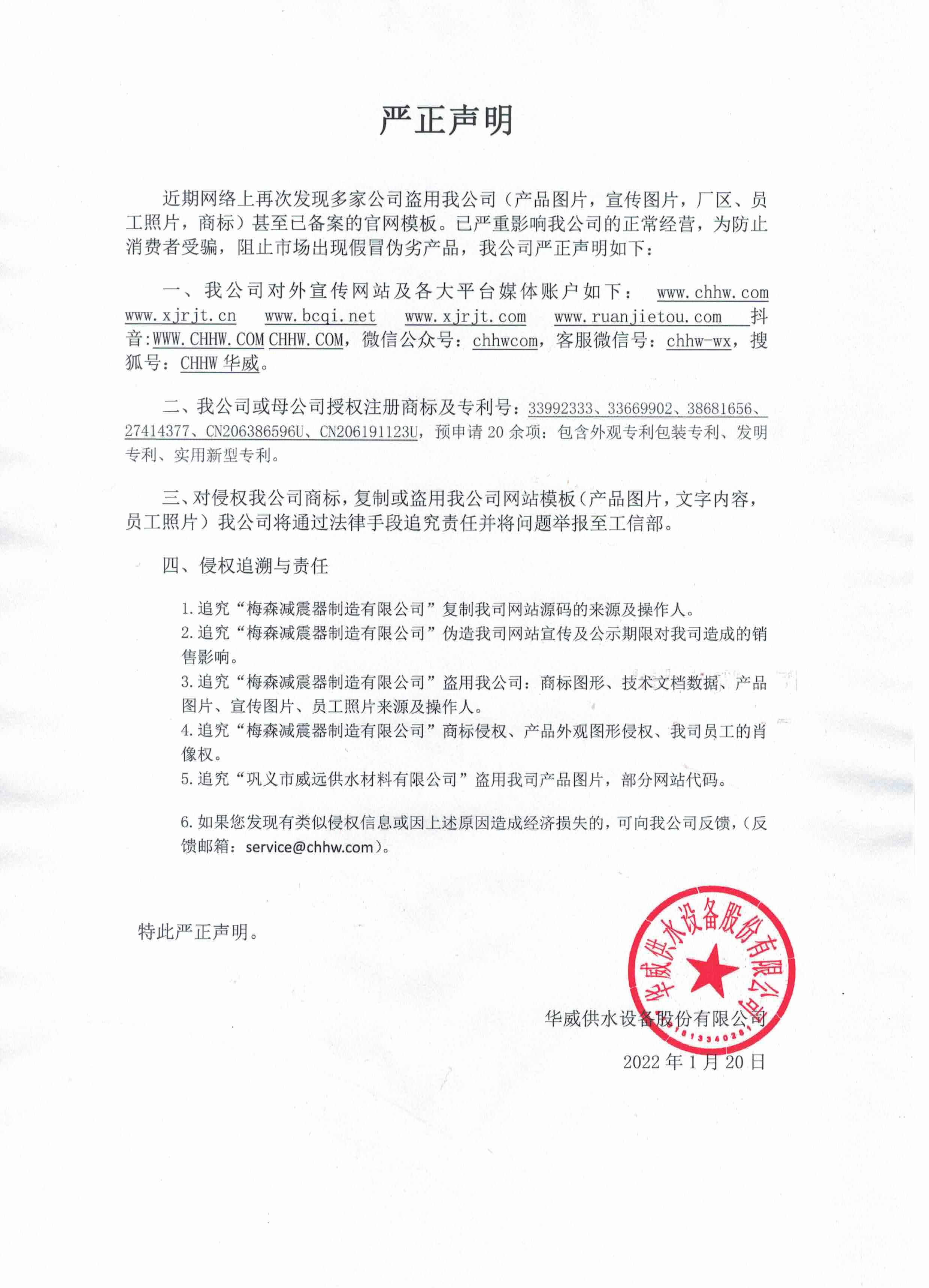 近期網(wǎng)絡(luò)上再次發(fā)現(xiàn)多家公司盜用我公司(產(chǎn)品圖片,宣傳圖片,廠區(qū)、員工照片,商標(biāo))甚至已備案的官網(wǎng)模板。已嚴(yán)重影響我公司的正常經(jīng)營(yíng),為防止消費(fèi)者受騙,阻止市場(chǎng)出現(xiàn)假冒偽劣產(chǎn)品,我公司嚴(yán)正聲明如下: