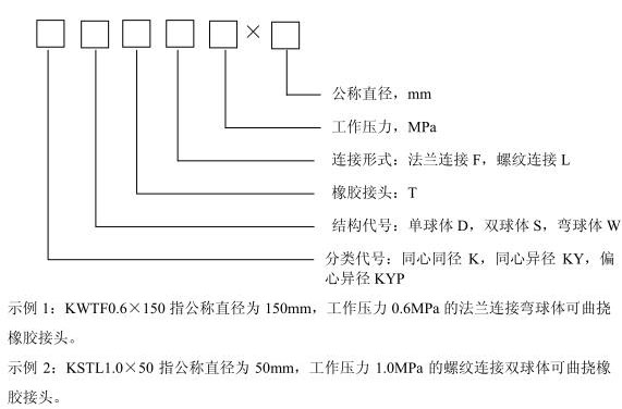 可曲撓橡膠接頭命名和型號(hào)由可曲撓橡膠接頭的分類、結(jié)構(gòu)形式、連接形式、通用名稱、工作壓力、公稱直徑組成。用漢語(yǔ)拼音字母和阿拉伯?dāng)?shù)字表示。